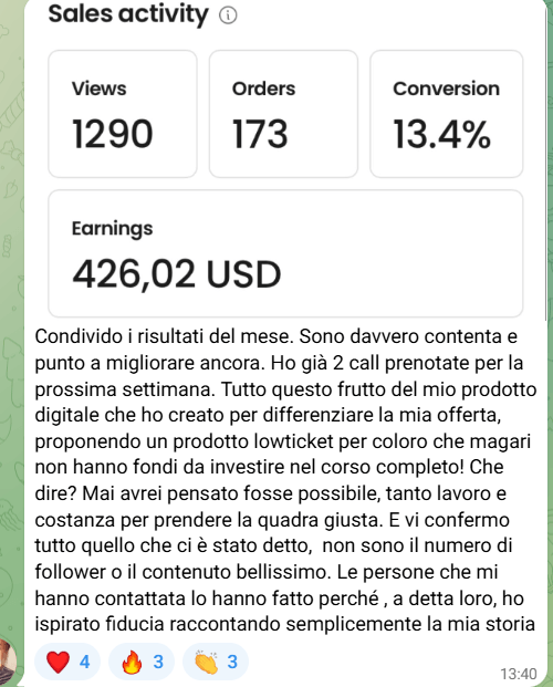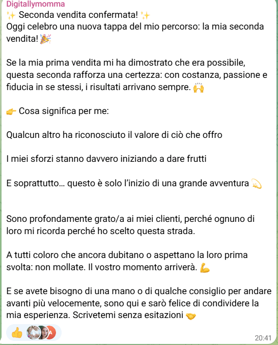 E passo dopo passo ho cominciato a vedere risultati concreti: il primo cliente, la prima vendita, il primo mese in cui ho guadagnato online lo ricorderò in eterno.